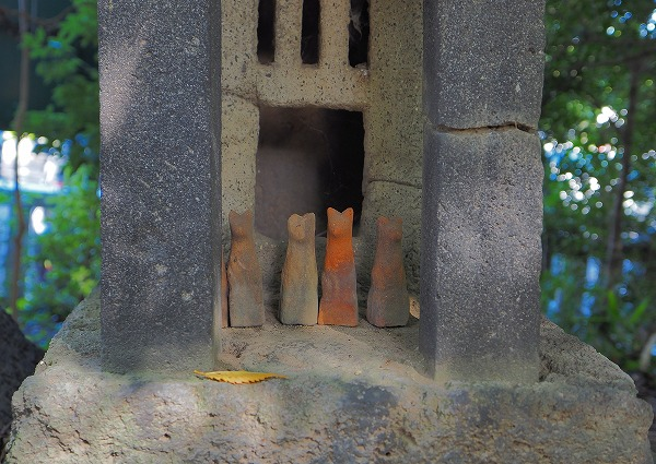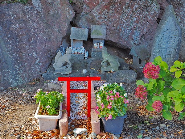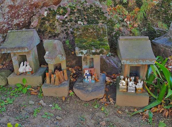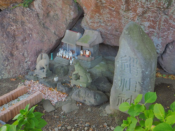 数は多くないが、巨石の袂に何体かの狐像が奉納されていた。